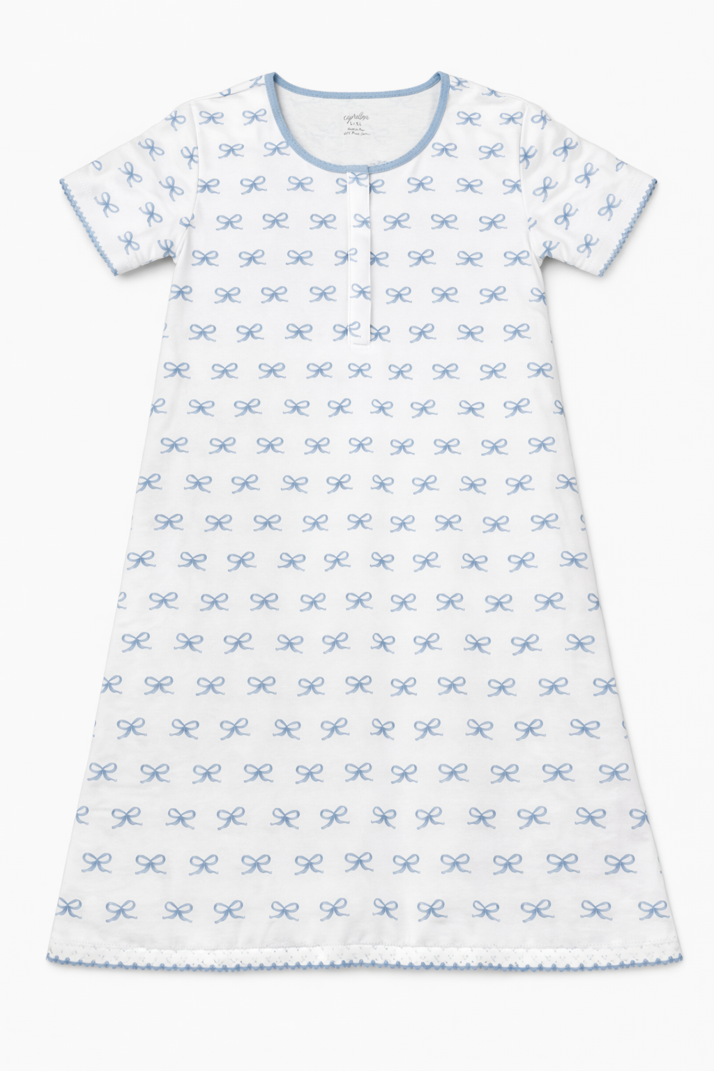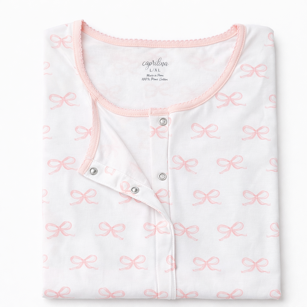 Designed with our delicate baby blue bow print and soft picot trim, this timeless nightgown pairs beautifully with our matching baby pajamas and newborn outfits, creating the sweetest mom and baby matching moments.